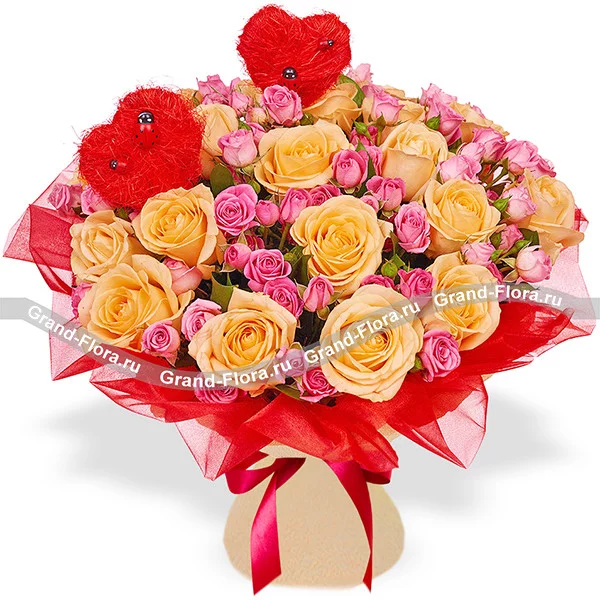 Моя Валентинка - букет из разноцветных роз с сердечками